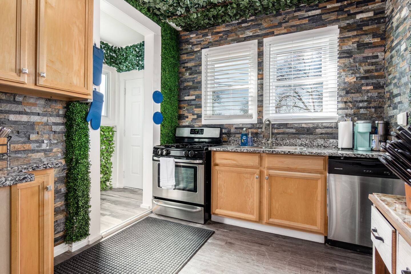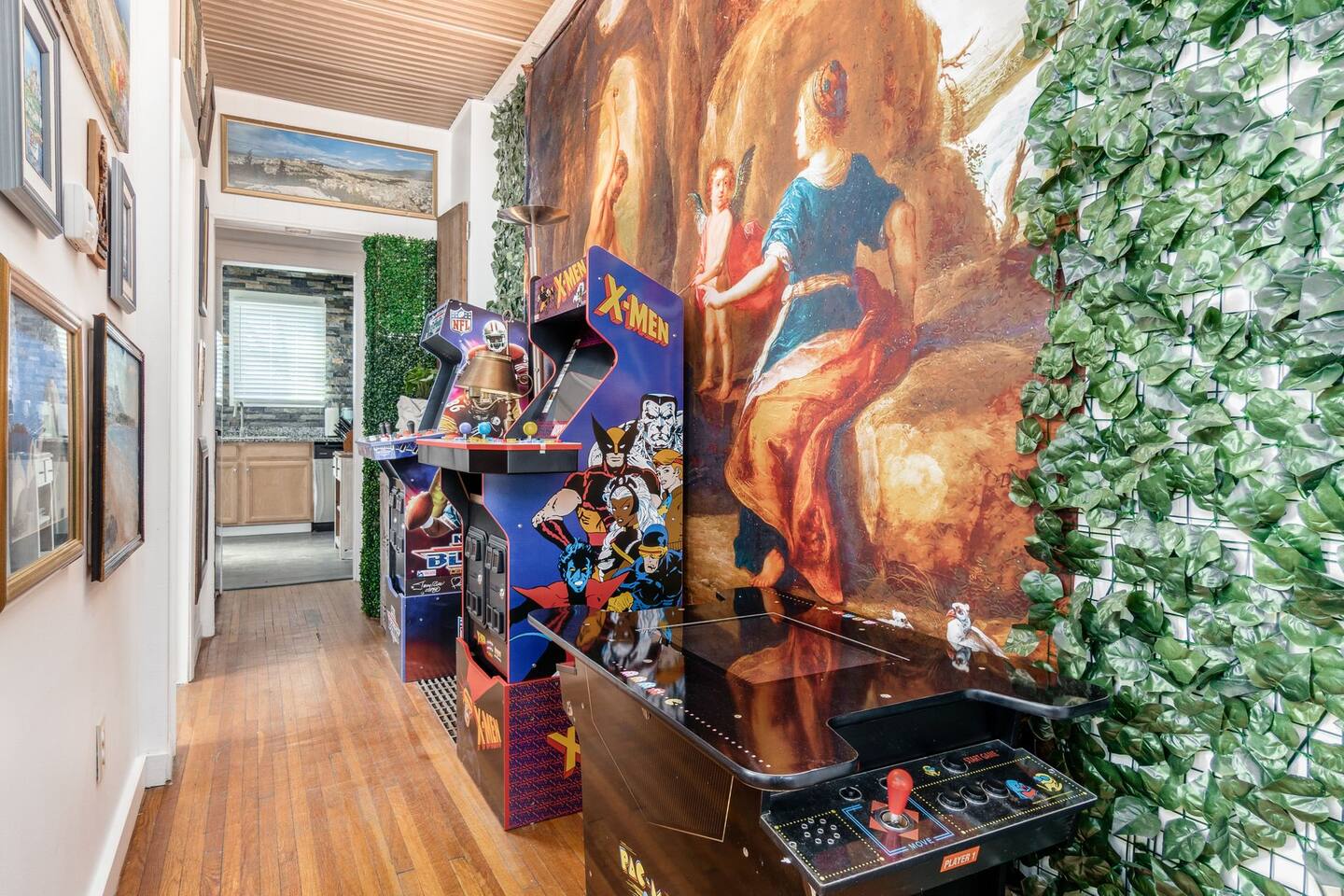• Five bedrooms, two full bathrooms. • Smart TVs in the living room and each bedroom, with access to any of your streaming subscriptions and complementary Sling TV service. • Play on our two slot machines (tokens cannot be exchanged for money, this is purely for fun) • Adjustable beds in each bedroom. • Fully equipped kitchen. • House is equipped with an arcade, slot machines, and laser projectors. • Small office area with desk and computer on the third floor. • Clean towels and linens are provided. • Combo washer/dryer in the upstairs bathroom. • The house is one side of a duplex and the front porch and back yard is shared.