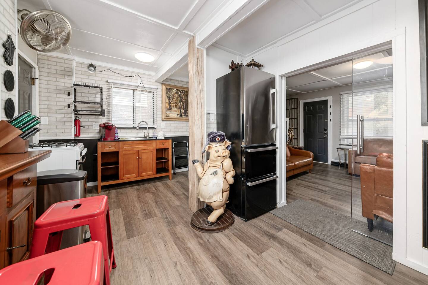 • Two bedrooms, one full bathroom. • Smart TVs in the living room and each bedroom, with access to any of your streaming subscriptions and complementary Sling TV service. • Adjustable beds in both bedrooms. • Fully equipped kitchen. • House is equipped with an arcade, game system, and laser projectors. • Fenced-in backyard with a grill, pool table, and patio seating, great for relaxing. • The house is small, only 796 square feet. • A futon and a sofa bed are available for larger groups. • Off street parking for two cars in front and beside the house. Additional off street parking in backyard for two more cars. Free on street parking in the area if you need more room.