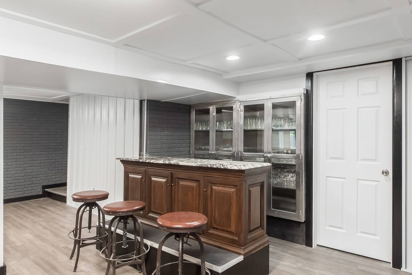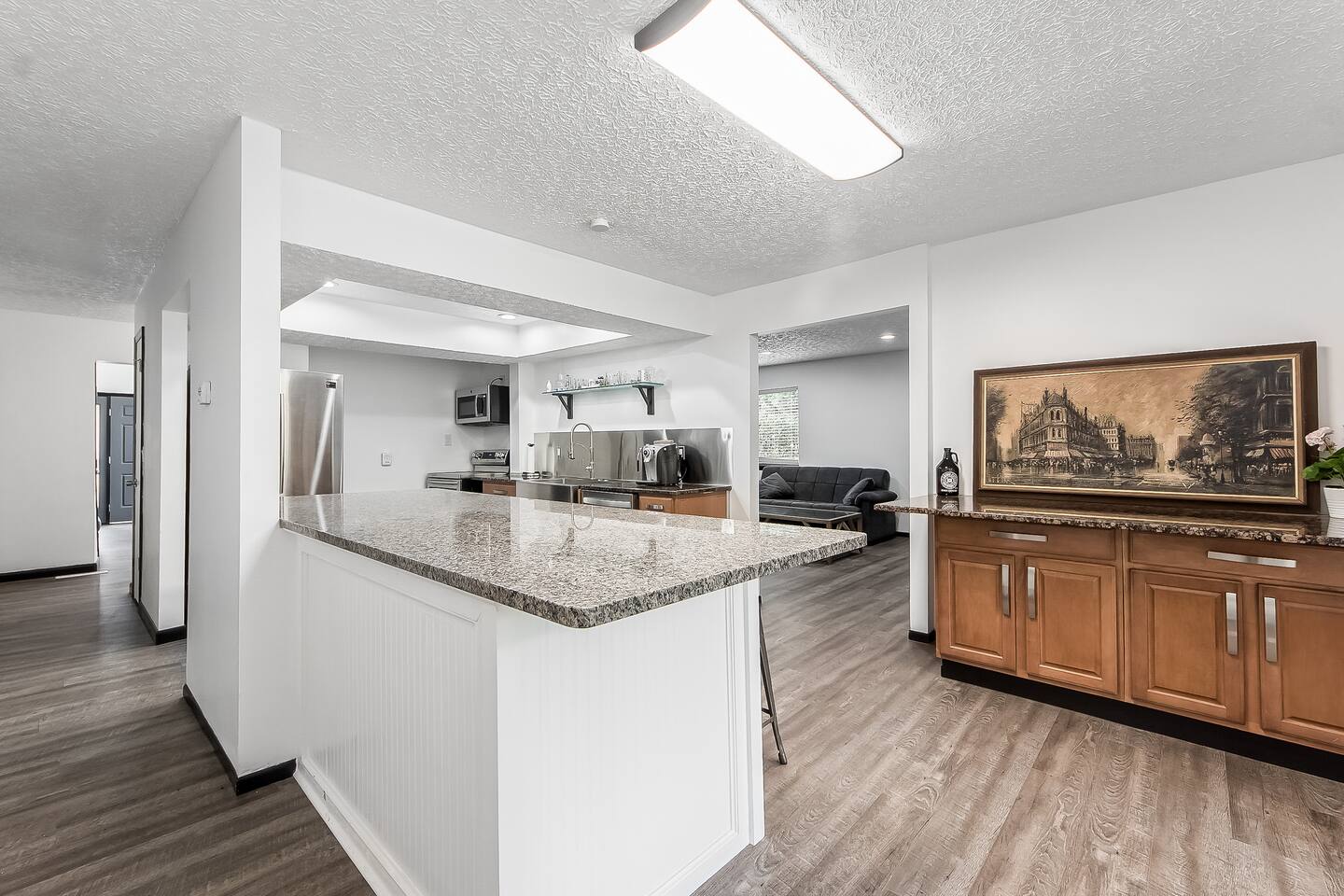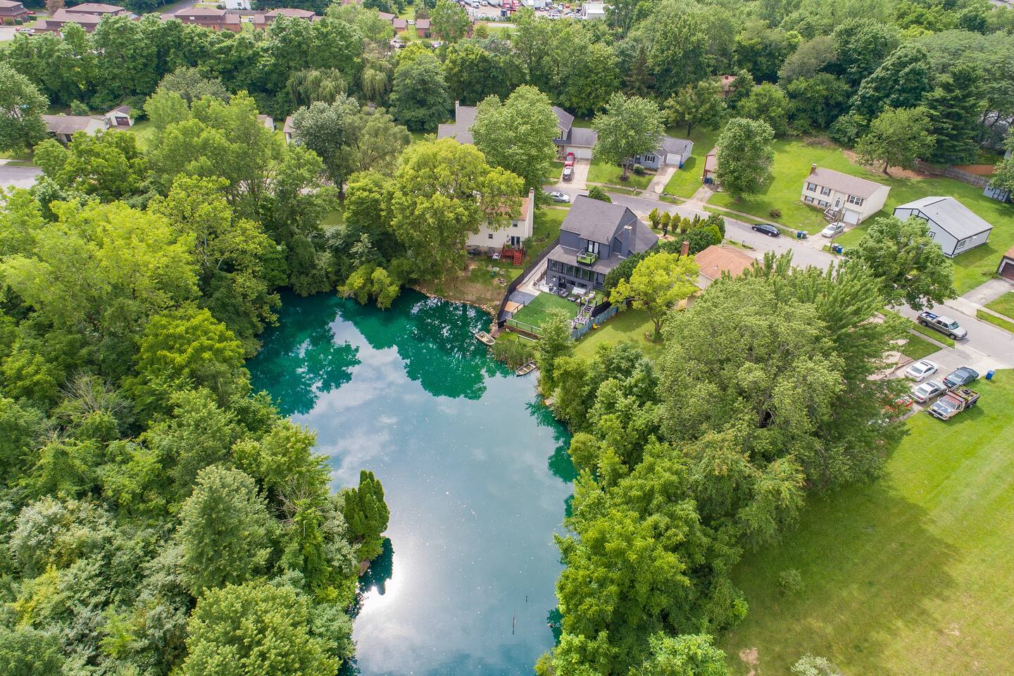 Enjoy your sleek and modern three-story 3,800 sq ft estate. 15% off stays of seven nights or more. Situated on a private pond, your home includes a commercial grade kitchen, onsite washer and dryer, game room, and professional home theater. Each bedroom has an adjustable bed and 55-inch Roku TV with easy access to your streaming subscriptions. This is the house from EKT's song "Famous." Less than 10 minutes to the airport or Easton Town Center, and 15 minutes to OSU and downtown.