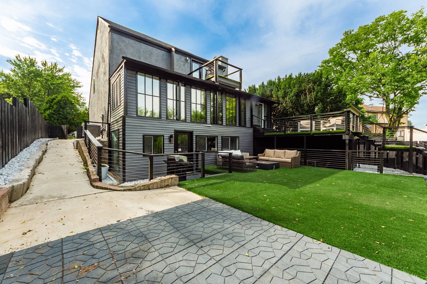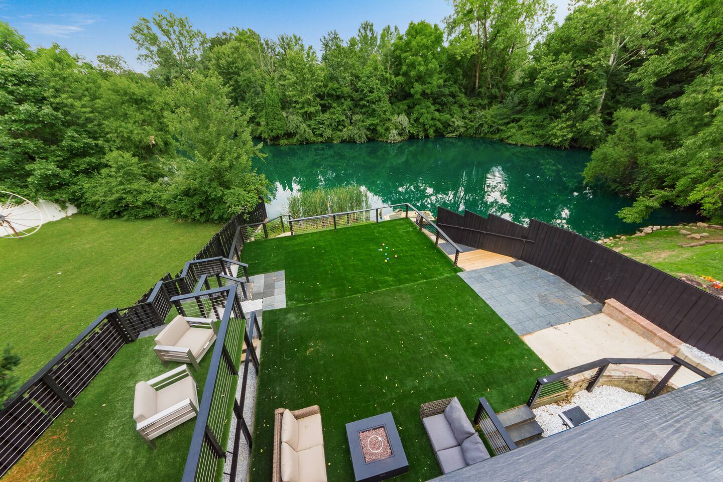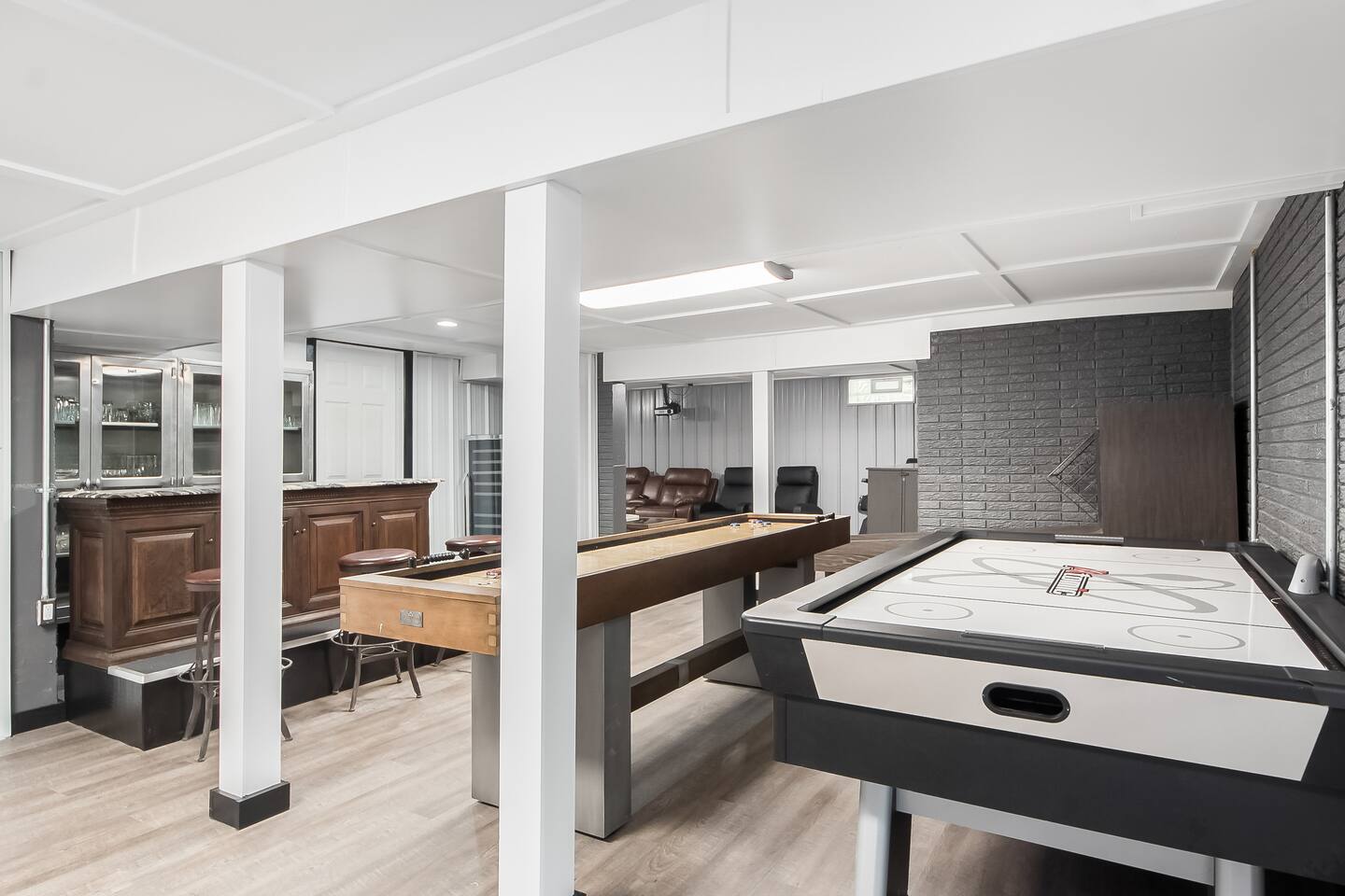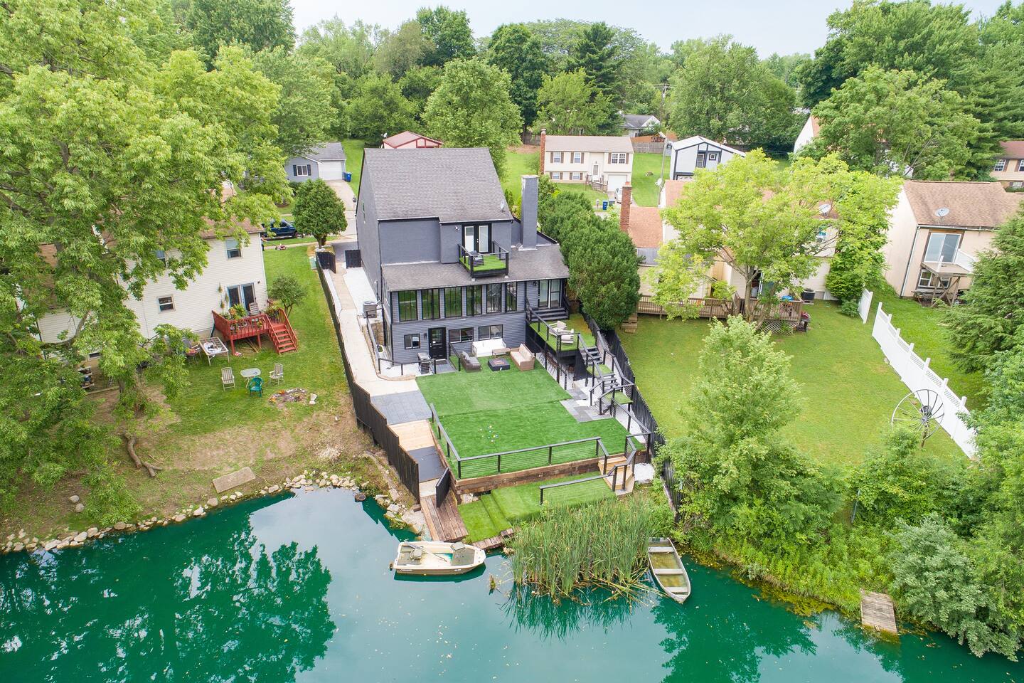 • Private neighborhood pond with access to boat and fishing. • Expansive deck with outdoor seating and grill. • Game room includes pool, foosball, ping pong, shuffleboard, and skee ball. • Fully equipped laundry room containing a washer, dryer, utility sink, ironing board and folding area • Off-street parking: one garage space, two spaces in driveway. • On-street parking: two spots directly in front of the house. Parking elsewhere on the street is not permitted. • Living room contains a 75” 4K television and oversized electric fireplace. • Fully equipped kitchen with new stainless steel appliances. • Master bedroom suite with private bathroom and balcony.