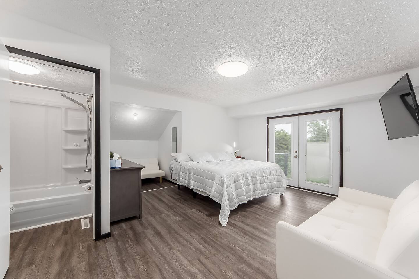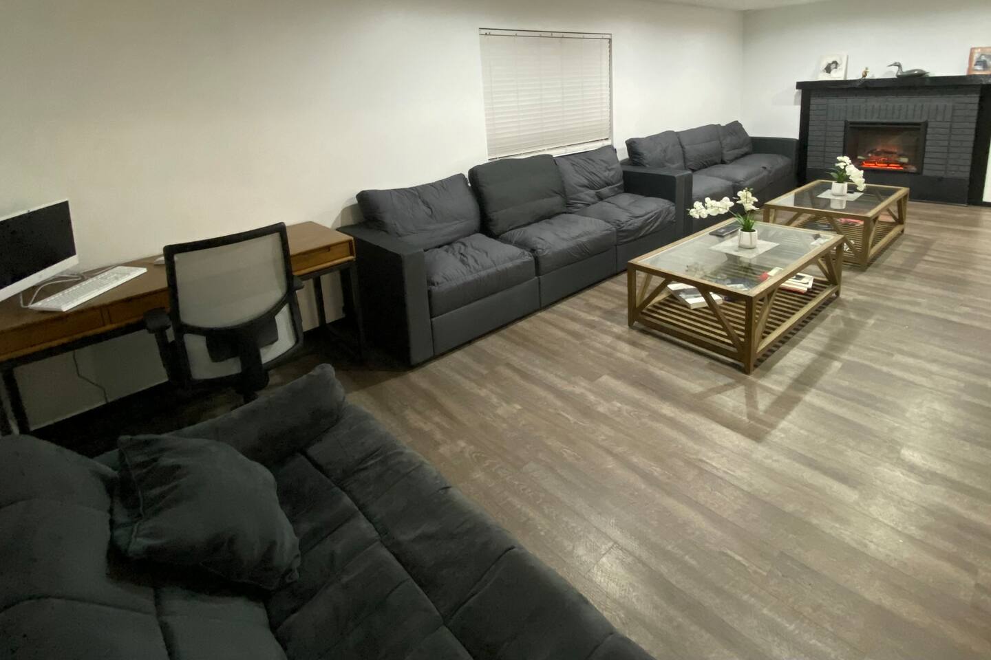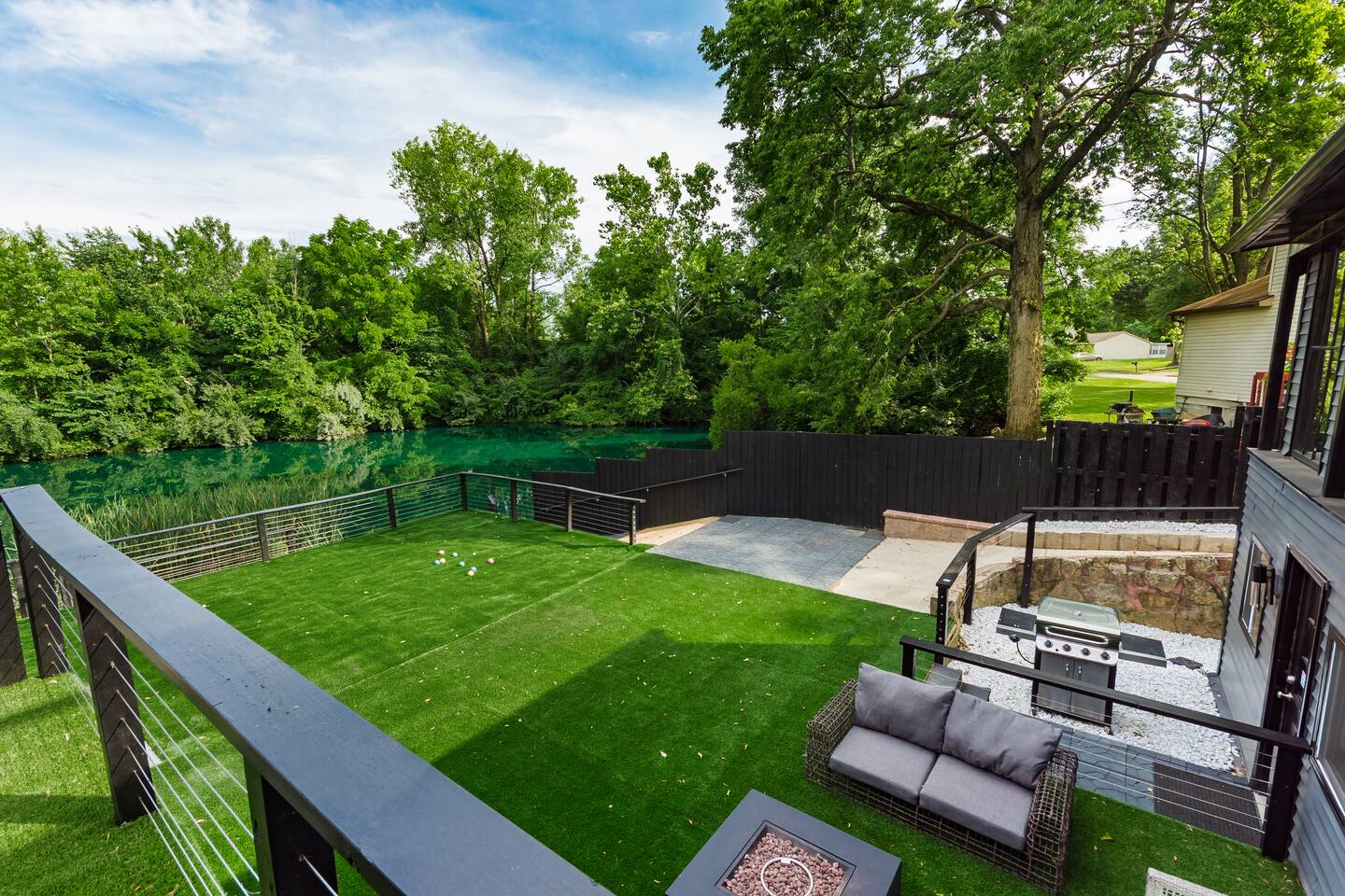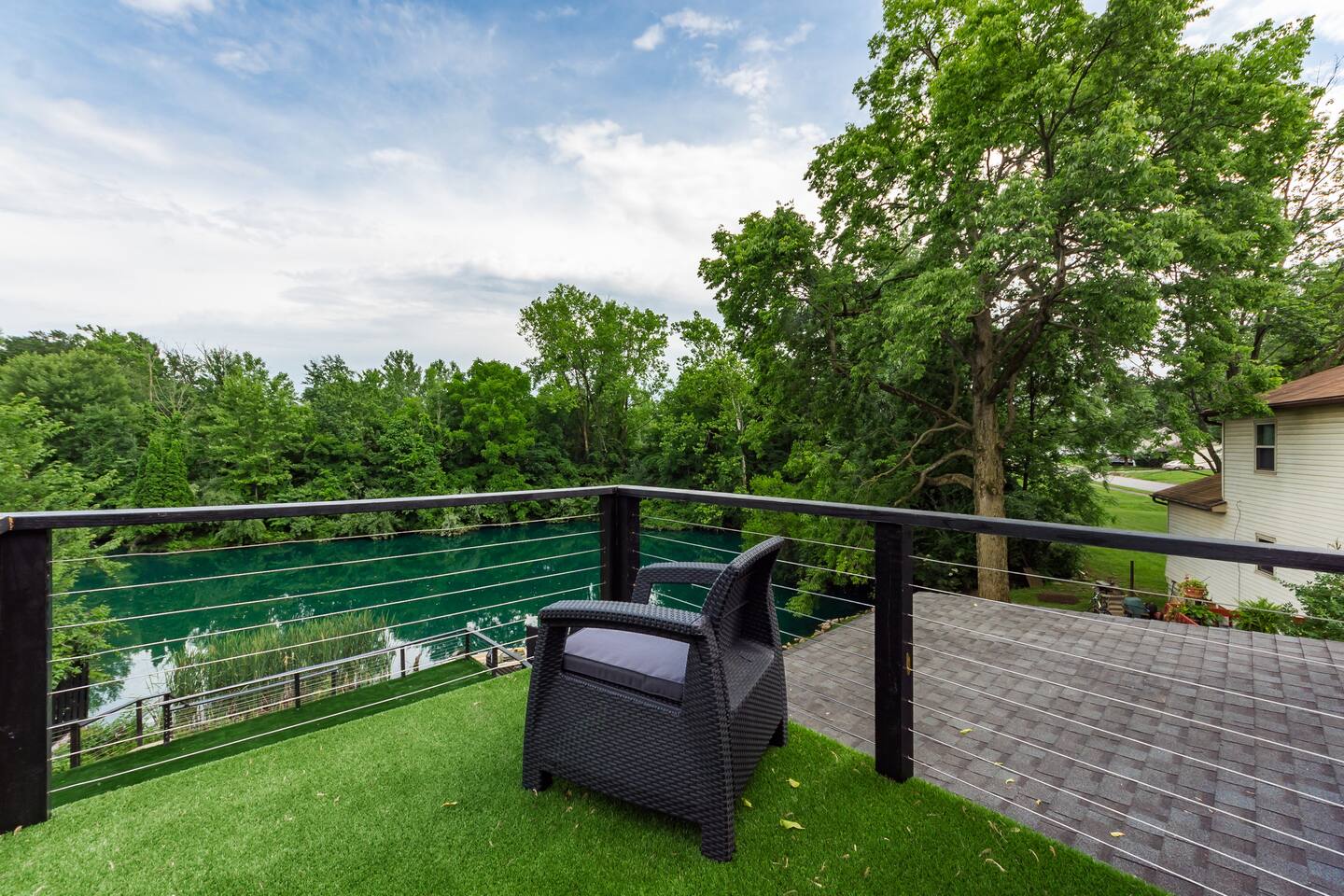• Private neighborhood pond with access to boat and fishing. • Expansive deck with outdoor seating and grill. • Game room includes pool, foosball, ping pong, shuffleboard, and skee ball. • Fully equipped laundry room containing a washer, dryer, utility sink, ironing board and folding area • Off-street parking: one garage space, two spaces in driveway. • On-street parking: two spots directly in front of the house. Parking elsewhere on the street is not permitted. • Living room contains a 75” 4K television and oversized electric fireplace. • Fully equipped kitchen with new stainless steel appliances. • Master bedroom suite with private bathroom and balcony.