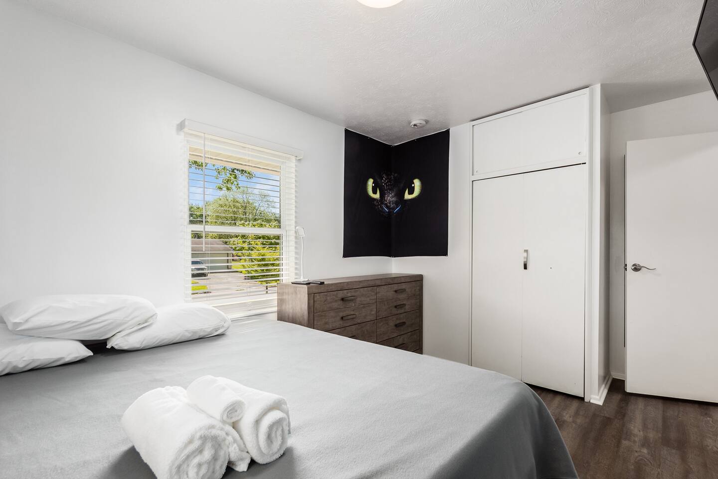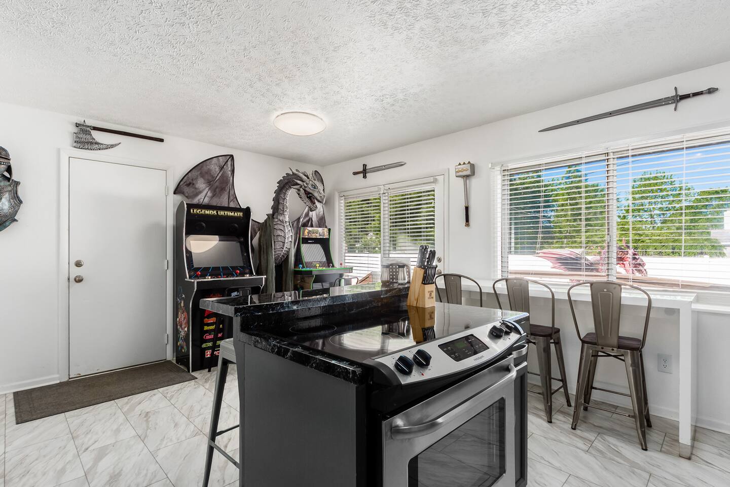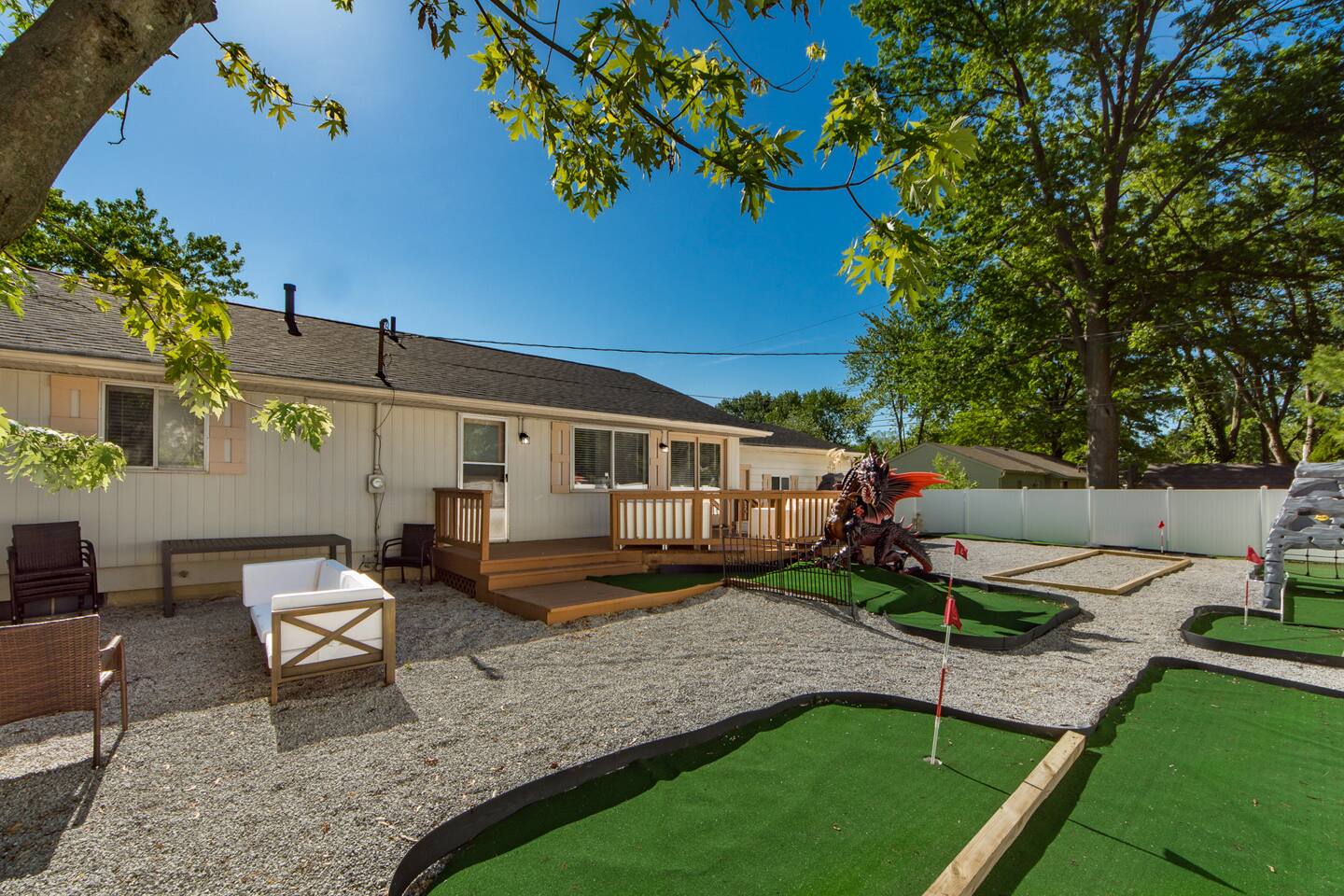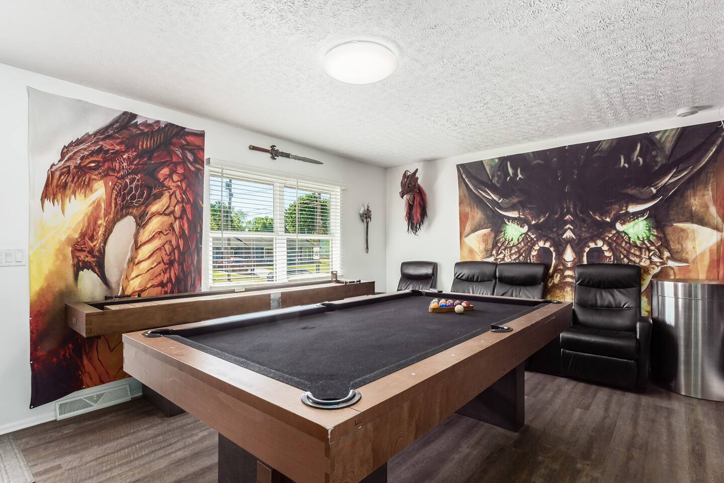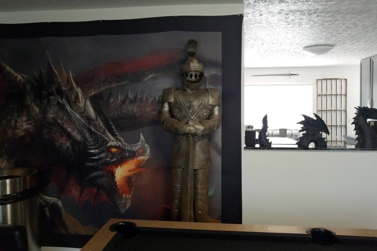 Are you looking for a unique stay with plenty of entertainment options? Our dragon-themed Westerville ranch is fun for the whole family. 15% off stays of seven nights or more. Inside the house you’ll find a massive 75” TV, a pool table, shuffleboard, and arcade cabinets. Each bedroom has an adjustable bed and 55” smart TV with easy access to your streaming subscriptions. The backyard is the real draw, featuring a badminton net, pop-up soccer goals, and even a small minigolf course.