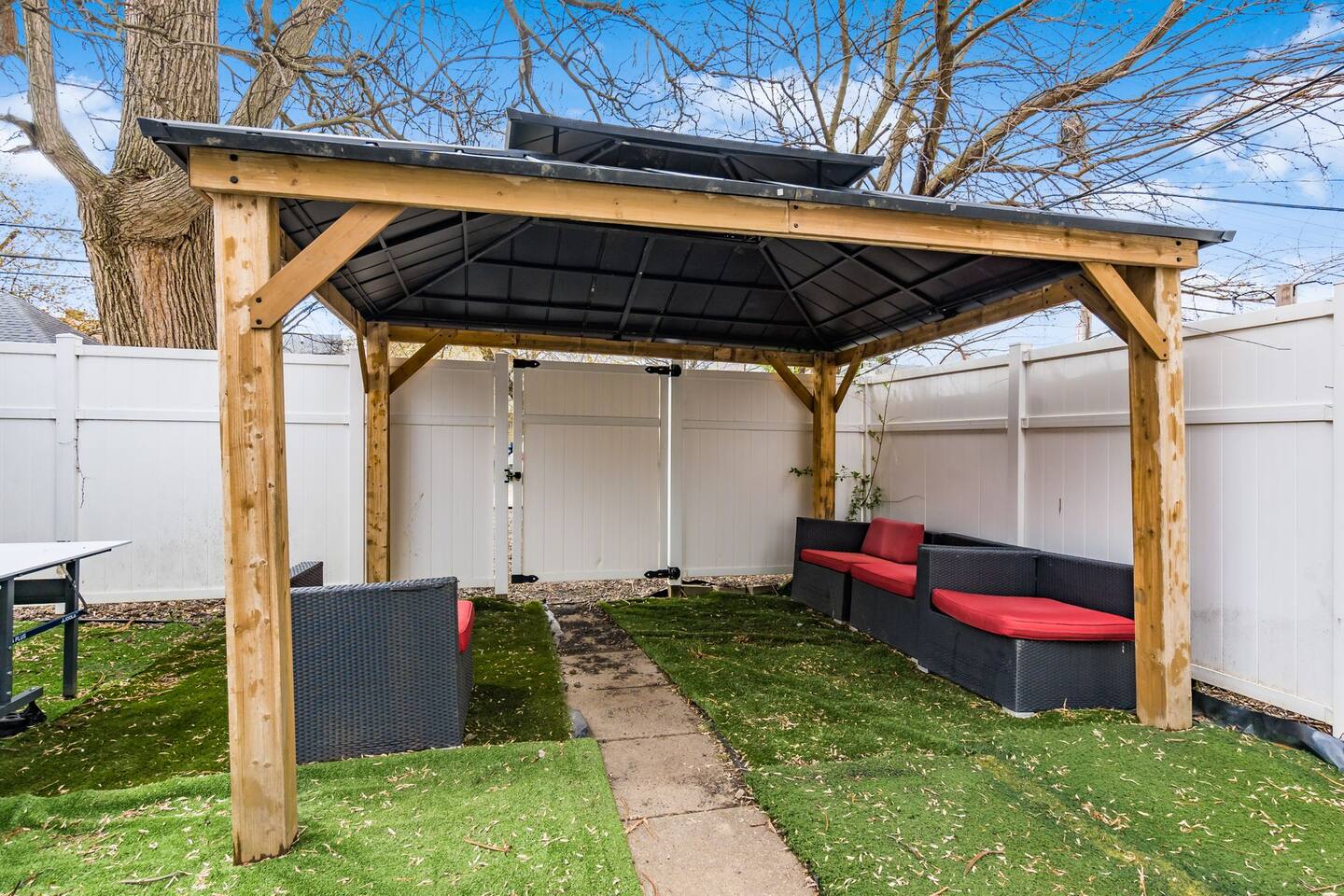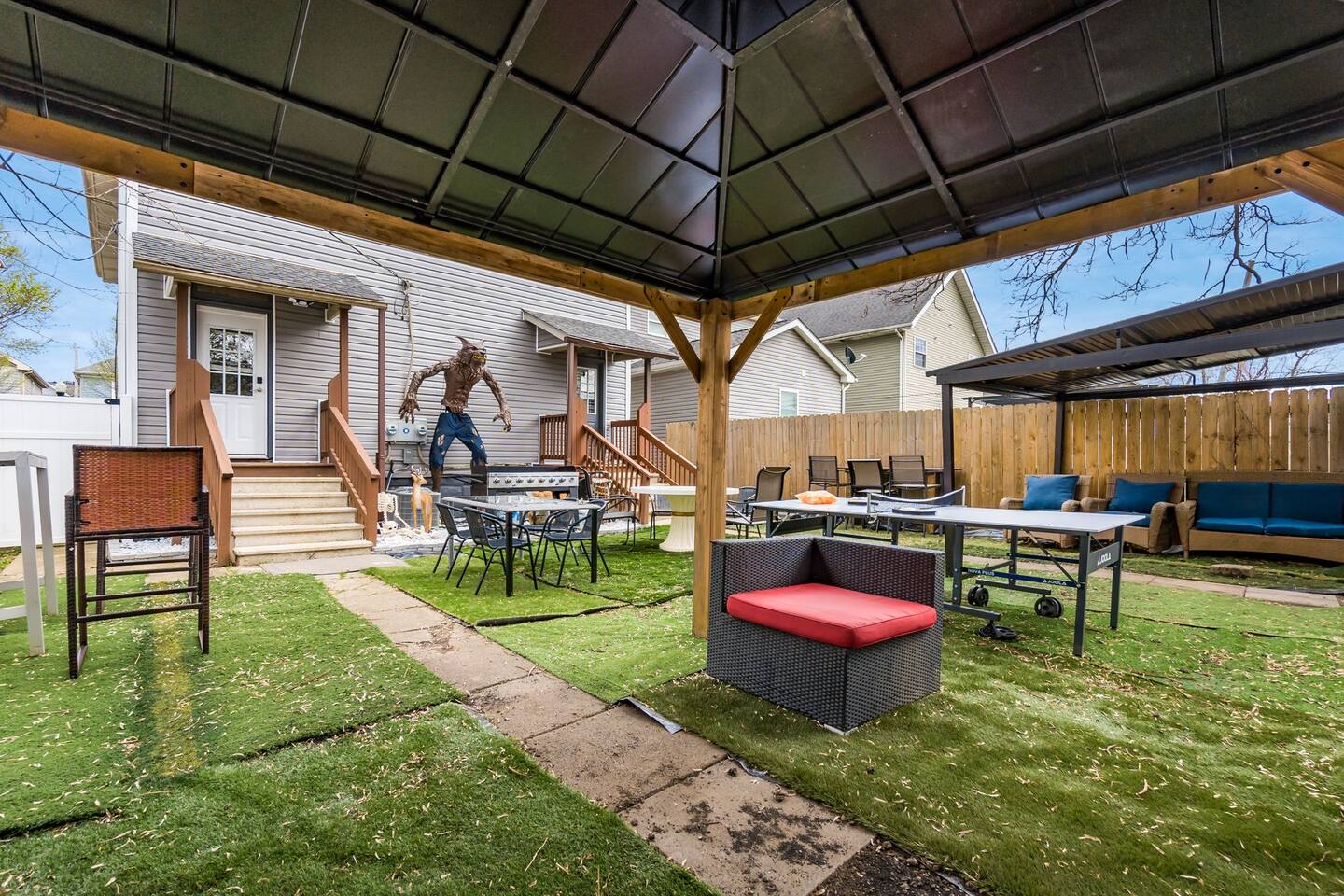 •House is one side of a duplex. While the unit is private, the backyard is shared. •Three bedrooms, one bathroom. • Smart TVs in the living room and each bedroom, with access to any of your streaming subscriptions and complementary Sling TV service. • Adjustable beds in each bedroom. • Fully equipped kitchen. • House is equipped with an arcade, card machine, and laser projectors. • Clean towels and linens are provided.