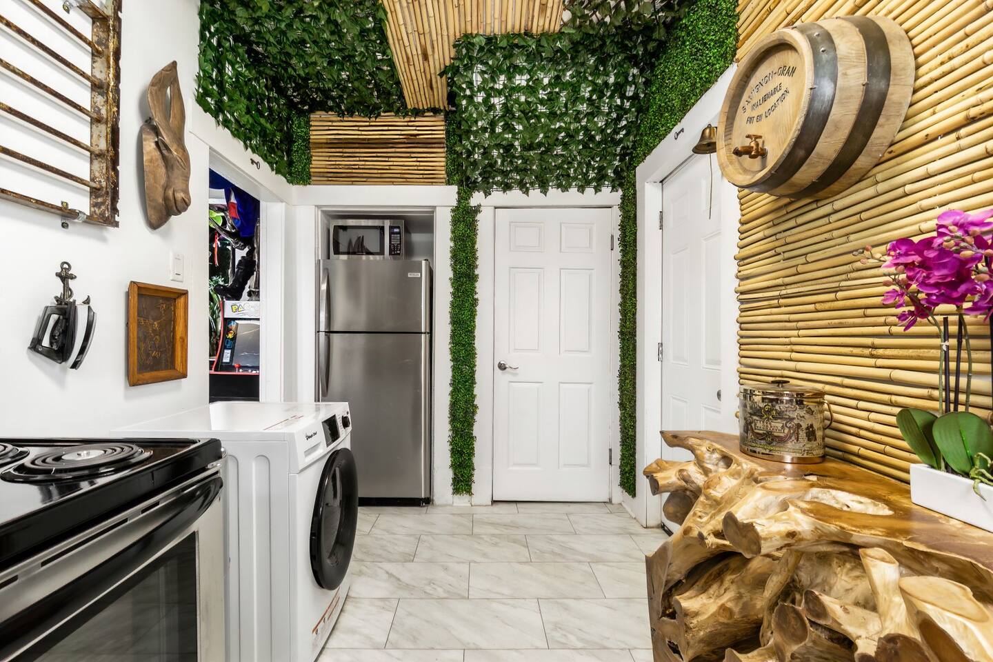 • Four bedrooms, one bathroom. • Please note that the attic bedroom can only be accessed by a hidden door in the 3rd bedroom. The entryway to the room is narrow, and not all guests may be able to squeeze through. • While the rest of the house has central A/C, the attic is cooled by a portable A/C unit. • Living room has a 70” smart TV with complementary Sling TV service and access to all your streaming subscriptions. • Each bedroom has an adjustable bed and 55” smart TV. • Kitchen has stainless steel appliances and comes equipped with basic cooking tools. • Office in the living room comes with a desk and computer. • Fenced in backyard with hammock, grill, and patio seating. • Clean towels and linens are provided. • Combo washer/dryer and ironing board in the kitchen.