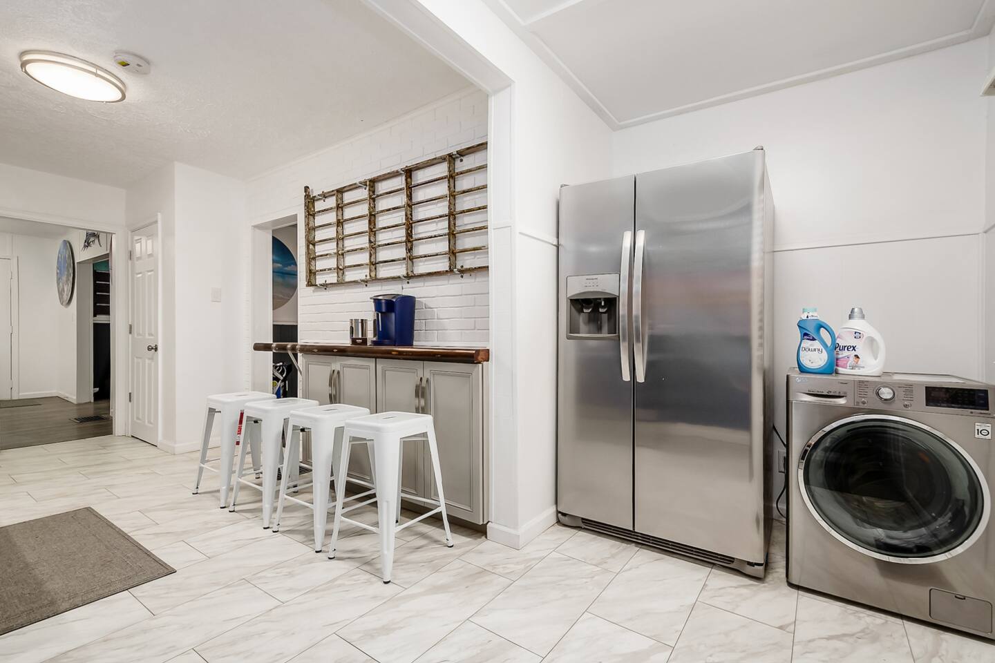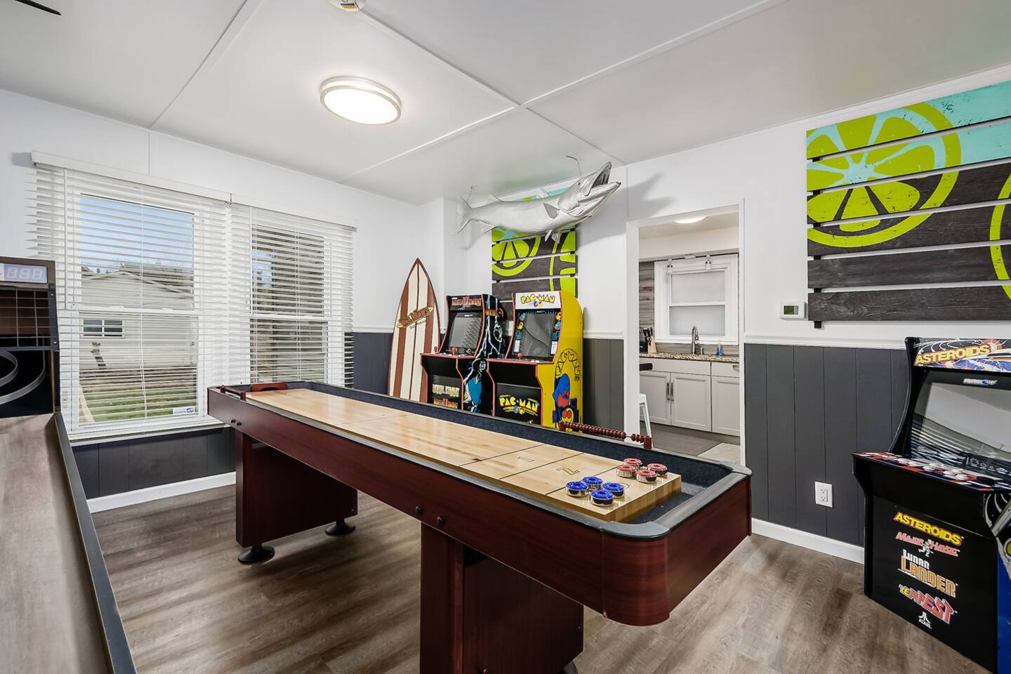 • Three bedrooms, one bathroom. The bedrooms and bathrooms are all on the second floor. • Smart TVs in the living room and each bedroom, with access to any of your streaming subscriptions and complementary Hulu TV service. • Fully equipped kitchen with new stainless steel appliances. • Game room includes arcade cabinets, skeeball, and shuffleboard. • Fenced in back yard, great for pets. • Off street parking for two cars in the garage. Plenty of on street parking if you need more room. • Clean towels and linens are provided.